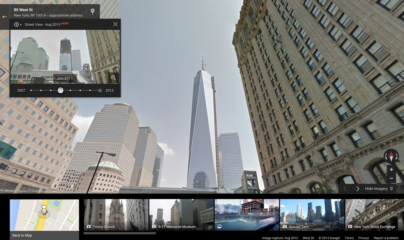 Έχοντας συλλέξει μια μοναδική συλλογή φωτογραφιών από σημαντικά σημεία του πλανήτη, εμβληματικά κτήρια και μνημεία, το Street View μας δίνει τη δυνατότητα να κάνουμε μια βουτιά στο παρελθόν, μέσα από το «έξυπνο» κινητό, Android ή Apple. Εάν πατήσουμε οπουδήποτε πάνω στην εικόνα μιας τοποθεσίας, μπορούμε εκτός από πληροφορίες για το σημείο, να επιλέξουμε «See more dates» για να δούμε τις παλαιότερες φωτογραφίες που έχουν δημοσιεύσειτα προηγούμενα 15 χρόνια.Έτσι, μπορούμε να δούμε όλες τις αλλαγές και μεταμορφώσεις, όπως για παράδειγμα πώς άλλαξε το Vessel στη Νέα Υόρκη με τη βήμα-βήμα ανέγερσή του.