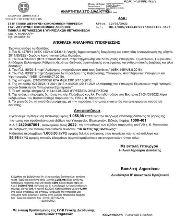 Μάλιστα, στο παραποιημένο έγγραφο αναγραφόταν ότι τα 1.055,98 ευρώ της πίστωσης από το υπ. Εξωτερικών προορίζονταν για την αγορά δελτίου ενίσχυσης του συγκεκριμένου συλλόγου, αλλά και την αγορά τοπικών εδεσμάτων.