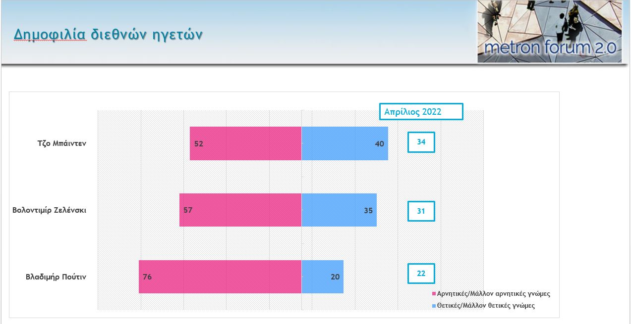 Ως προς τη δημοφιλία των διεθνών ηγετών, ο Τζο Μπάιντεν παίρνει τις περισσότερες θετικές με 34% αλλά και αρνητικές 52%. Ο Βολοντιμίρ Ζελένσκι αξιολογείται θετικά από το 35% και αρνητικά από το 57% ενώ ο Βλαντιμίρ Πούτιν αξιολογείται θετικά από το 20% και αρνητικά από το 76%.