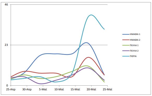Από τα δεδομένα των παγίδων στις περιοχές της Ημαθίας και της Πέλλας η πτήση του εντόμου εμφανίζει σημαντική αύξηση των συλλήψεων, το χρονικό διάστημα 18-20 Μαΐου.