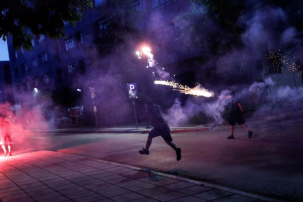 Οι κουκουλοφόροι πέταξαν μολότοφ, πέτρες και πυροτεχνήματα, με τους αστυνομικούς να απαντούν κάνοντας χρήση χημικών και χειροβομβίδων κρότου λάμψης.