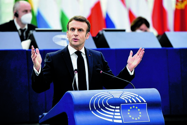 Ο πρόεδρος της Γαλλίας, η οποία ασκεί την κυλιόμενη προεδρία της Ενωσης μέχρι το τέλος του Ιουνίου, έκανε αίσθηση στις 9 Μαΐου στο Στρασβούργο τασσόμενος υπέρ της μεταρρύθμισης των ευρωπαϊκών συνθηκών για την ενίσχυση της αποτελεσματικότητας της ΕΕ και με την πρότασή του για την δημιουργία μίας «ευρωπαϊκής πολιτικής κοινότητας» για την ταχύτερη πρόσδεση της Ουκρανίας στην Ευρώπη μετά την ρωσική εισβολή της 24ης Φεβρουαρίου.