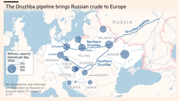 Το υπόλοιπο 10%, όπως είναι γνωστό, αντιστοιχεί στις ανάγκες της Ουγγαρίας, της Τσεχίας και της Σλοβακίας. Πρόκειται για τις τρεις χώρες της ανατολικής Ευρώπης οι οποίες εξαρτώνται άμεσα από το ρωσικό πετρέλαιο που φτάνει σε αυτές μέσω του Druzhba και δεν μπορούν εύκολα να το αναπληρώσουν μέσω άλλων «οδών», ειδικά καθώς δεν έχουν πρόσβαση στη θάλασσα.