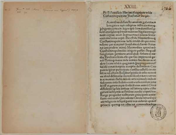 Ειδικότερα, η πρώτη περιγραφή της Αλώσεως της Κωνσταντινούπολης που κυκλοφόρησε σε έντυπη μορφή, συντάχθηκε από τον πάπα Πίο Β΄ και εκδόθηκε για πρώτη φορά στη Ρώμη περίπου το 1470. Ακολούθησαν η παρούσα δεύτερη έκδοση (π. 1474), από την οποία είναι γνωστά μόνο 23 αντίτυπα και ακόμη μία μεταξύ 1488-1490. Κατά το ABPC (American Book Prices Current) καμία από τις τρεις αρχέτυπες εκδόσεις δεν έχει εμφανιστεί σε δημοπρασία τα τελευταία 40 χρόνια.