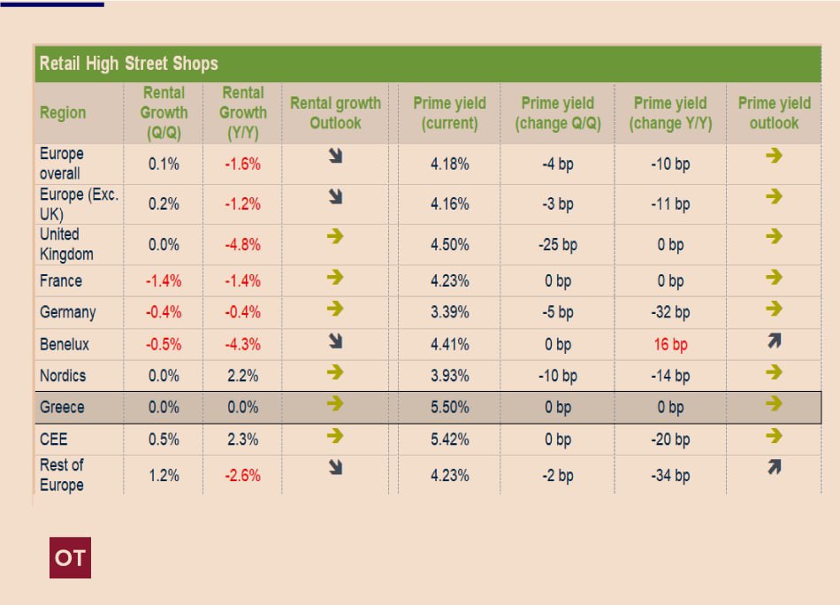 Οι πιέσεις στον τομέα του λιανικού εμπορίου συνεχίζουν να μειώνονται, με τα ενοίκια να επηρεάζονται θετικά για πρώτη φορά από το τέταρτο τρίμηνο του 2019, αν και με πολύ μέτρια άνοδο +0,1%.