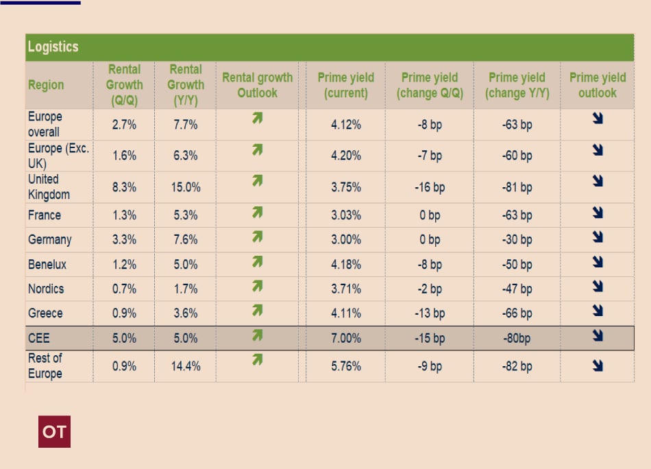 Κατά το πρώτο τρίμηνο του 2022 τα ενοίκια logistics αυξήθηκαν κατά 7,7% σε ετήσια βάση, η ισχυρότερη ανάπτυξή τους από έτος σε έτος από το 4ο τρίμηνο του 2000 (8,0%). Όλες οι αγορές σημείωσαν ανάπτυξη με επικεφαλής το Ηνωμένο Βασίλειο (+15,0%), την Κεντρική και Ανατολική Ευρώπη (+7,7%) και τη Γερμανία (+7,6%), υπογραμμίζοντας την συνεχιζόμενη ισχυρή ζήτηση και την έλλειψη καλού προϊόντος στην κατηγορία αυτή.