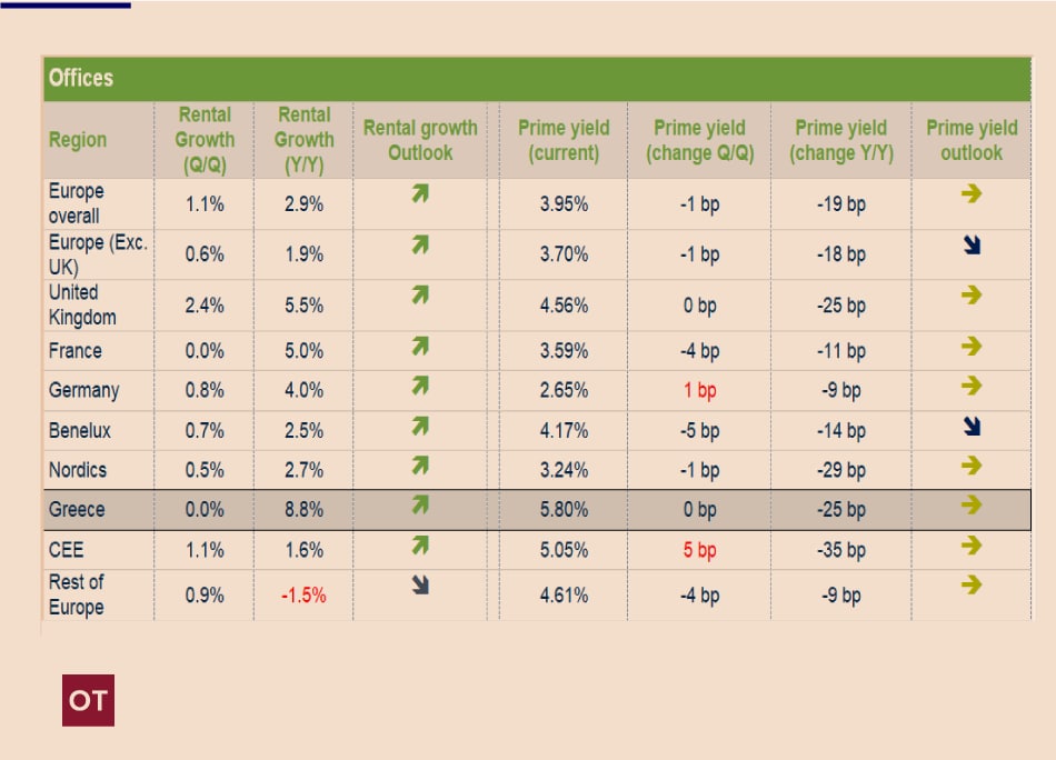 Τα ενοίκια γραφείων σε όλη την Ευρώπη αυξήθηκαν στο +1,1% σε τριμηνιαία βάση το πρώτο τρίμηνο του 2022, από +0,8% το τέταρτο τρίμηνο του 2021 και από (0,0%) το πρώτο τρίμηνο του 2021. Αυτό ώθησε την ετήσια ανάπτυξη στο +2,9% με όλες τις βασικές αγορές από έτος σε έτος.