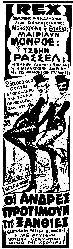 »Ολόκληρο το φίλμ “ΟΙ ΑΝΔΡΕΣ ΠΡΟΤΙΜΟΥΝ ΤΙΣ ΞΑΝΘΕΣ” (Ρεξ), βασίζεται στην βαθειά αυτή φιλοσοφία, και στα ασυναγώνιστα θέλγητρα της Μαίριλυν Μονρόε, φωτογραφισμένα αριστοτεχνικώτατα».