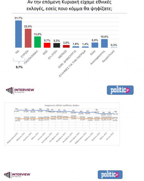 Συγκεκριμένα, σύμφωνα με την έρευνα της εταιρείας που διενεργήθηκε για λογαριασμό της σελίδας politic.gr, στην πρόθεση ψήφου, η ΝΔ συγκεντρώνει 31,7% (έναντι 31%), ο ΣΥΡΙΖΑ 22% (έναντι 22,2%), ενώ το ΠΑΣΟΚ-ΚΙΝΑΛ ενισχύει το ποσοστό του στο 13% (έναντι 12,5%). Ακολουθούν το ΚΚΕ με 5,7%, η Ελληνική Λύση με 5,3% και το ΜέΡΑ25 με 3%.
