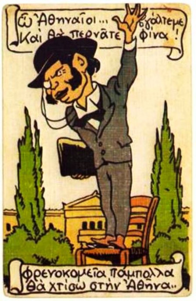 Δεν άφηνε ευκαιρία που να μη δώσει το παρών έστω και απρόσκλητος. Όταν είδε κόσμο συγκεντρωμένο έξω από τα γραφεία της εφημερίδας Ακρόπολις και πληροφορήθηκε την επίσκεψη του ηθοποιού Βίλλυ Φριτς, μπήκε ορμητικός για να καλωσορίσει μεγαλόπρεπα τον «ένδοξο φίλο» στην «τρισένδοξον χώρα μας».