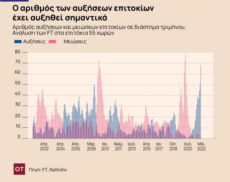 Οι υπεύθυνοι χάραξης πολιτικής σε όλο τον κόσμο έχουν ανακοινώσει περισσότερες από 60 αυξήσεις στα τρέχοντα βασικά επιτόκια τους τελευταίους τρεις μήνες, σύμφωνα με ανάλυση των δεδομένων των κεντρικών τραπεζών από τους FT – είναι ο μεγαλύτερος αριθμός τουλάχιστον από την αρχή του 2000.