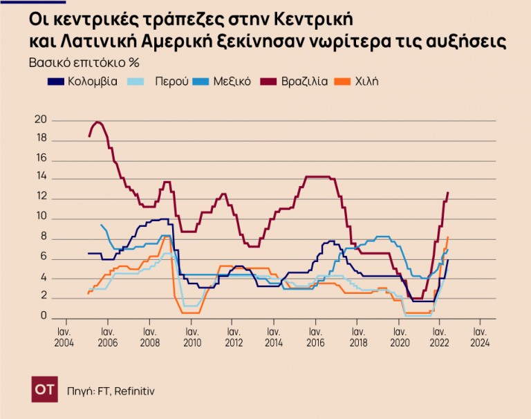 Οι αναδυόμενες αγορές στη Λατινική Αμερική ξεκίνησαν κύκλους σύσφιξης πέρυσι, καθώς οι οικονομίες τους υπέστησαν ζημιές από την πανδημία. Η Βραζιλία αύξησε τα επιτόκια 10 φορές σε λίγο περισσότερο από ένα χρόνο στο 12,75 τοις εκατό, από μόλις 2 τοις εκατό τον Μάρτιο του περασμένου έτους. Το Μεξικό, το Περού, η Κολομβία και η Χιλή έχουν επίσης αυξήσει το κόστος δανεισμού.