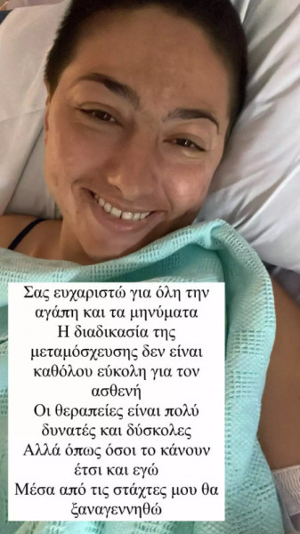 «Σας ευχαριστώ για όλη την αγάπη και τα μηνύματα. Η διαδικασία της μεταμόσχευσης δεν είναι καθόλου εύκολη για τον ασθενή. Οι θεραπείες είναι πολύ δυνατές και δύσκολες. Αλλά όπως όλοι όσοι το κάνουν, έτσι και εγώ, μέσα από τις στάχτες μου θα ξαναγεννηθώ. Και αν χάνομαι για μέρες είναι γιατί δίνω χρόνο στο σώμα μου και το πνεύμα μου να αντέξουν. Με το καλό όταν βγω θα σας τα πω όλα. Είπαμε, η ζωή έρχεται μέσα από τον πόνο. Ακόμα και όταν γεννιόμαστε η μαμά μας πονάει, μετά όμως… Έρχεται η ζωή. Να πιστεύετε», έγραψε χαρακτηριστικά.