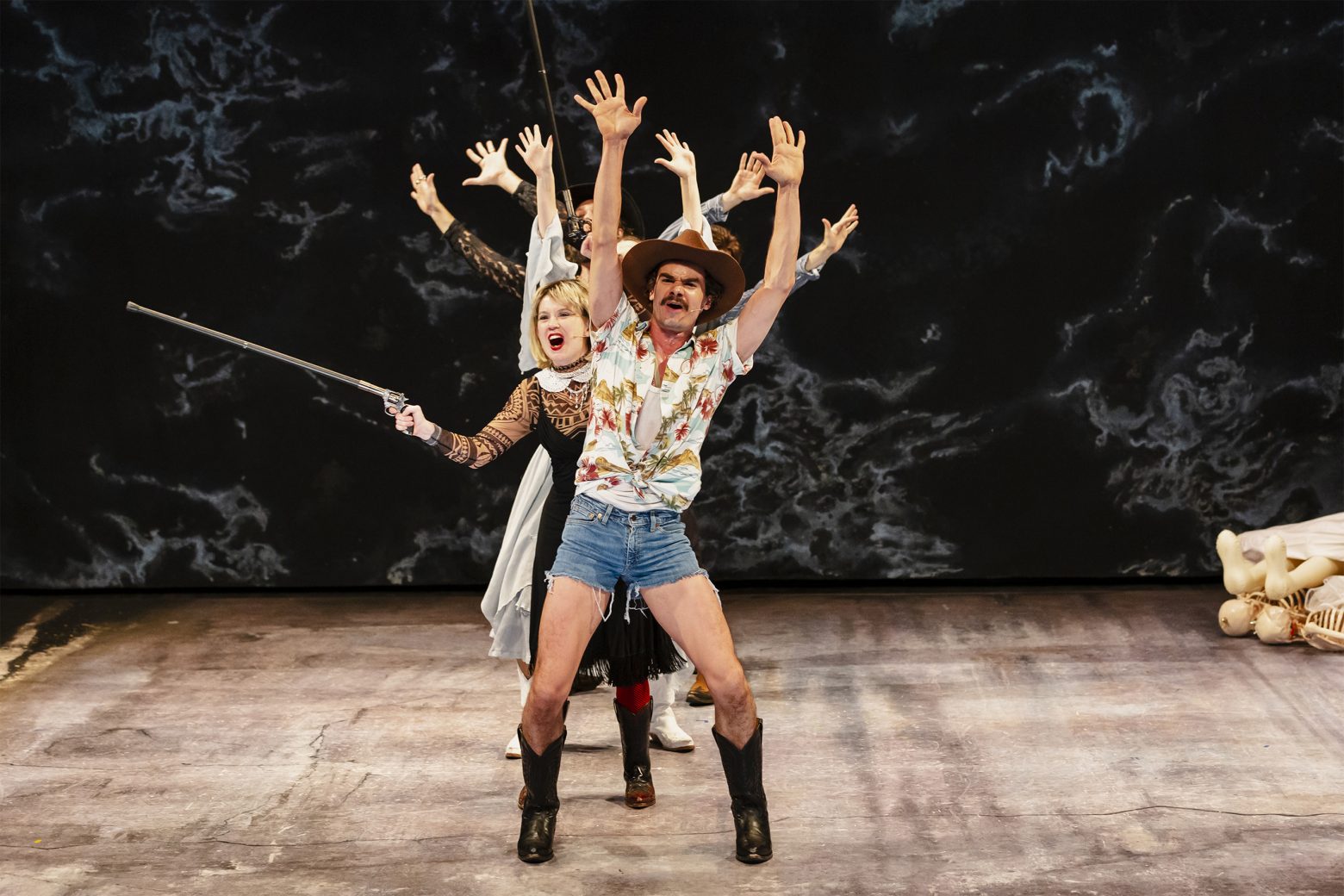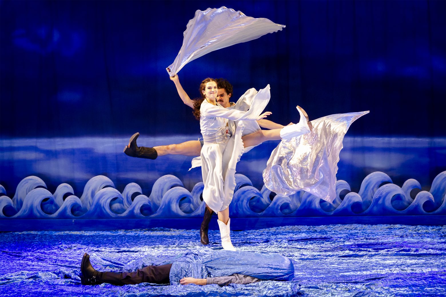 Εντυπωσιακά σκηνικά και κοστούμια, τραγούδι, χορός, δυνατή country μουσική, πλαισιώνουν την οπερατική αυτή περφόρμανς.