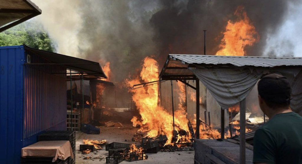 Φωτογραφίες που έδωσε στη δημοσιότητα το πρακτορείο του Ντονέτσκ δείχνουν την κεντρική αγορά Μαΐσκι να έχει τυλιχθεί στις φλόγες και τουλάχιστον ένα πτώμα.
