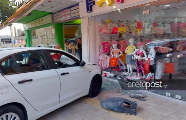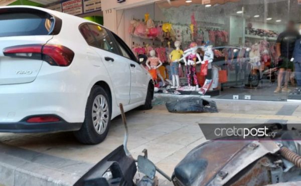 Ηράκλειο: Αυτοκίνητο παρέσυρε δίκυκλα και «μπούκαρε» σε τζαμαρία καταστήματος
