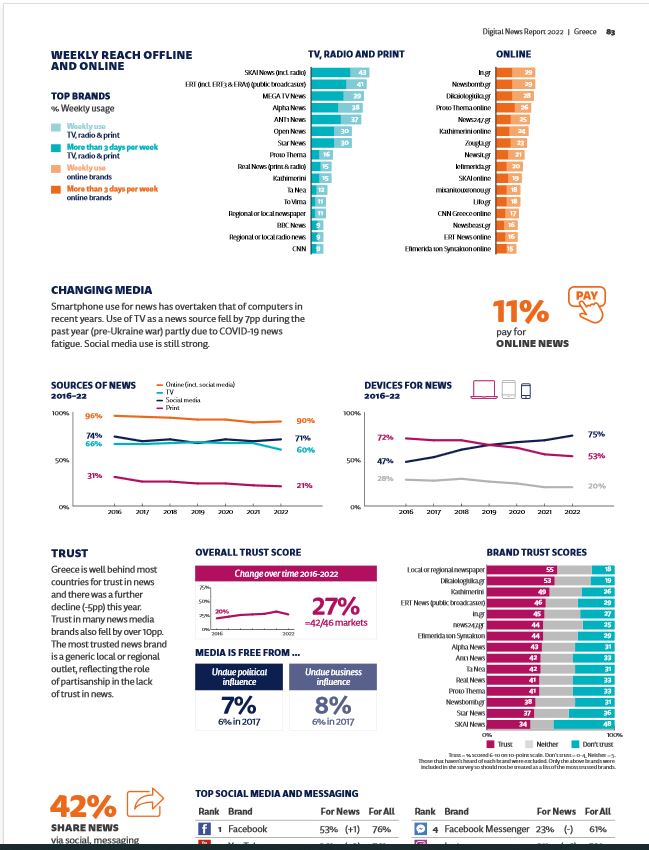 Στην έκθεση με τίτλο: Digital News Report 2022 του Reuters, πέραν των βασικών συμπερασμάτων για τα παγκόσμια Μέσα Ενημέρωσης που δημοσιεύονται, τις τάσεις των αναγνωστών και την αξιοπιστία των ΜΜΕ, υπάρχει και ανάλυση για κάθε χώρα ξεχωριστά, επομένως και για την Ελλάδα.