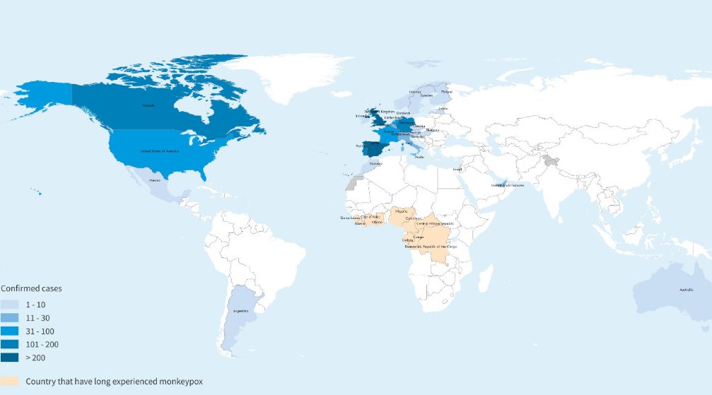 Έως τις 8 Ιουνίου 2022, έχουν αναφερθεί συνολικά 1285 εργαστηριακά επιβεβαιωμένα κρούσματα και ένα πιθανό σε χώρες : Αργεντινή, Καναδάς, Μεξικό, ΗΠΑ, Μαρόκο, Ηνωμένα Αραβικά Εμιράτα, Αυστρία, Βέλγιο, Τσεχία, Δανία, Φιλανδία, Γαλλία, Γερμανία, Ουγγαρία, Ιρλανδία, Ισραήλ, Ιταλία, Λετονία, Μάλτα, Ολλανδία, Νορβηγία, Πορτογαλία, Σλοβενία, Ισπανία, Σουηδία, Ελβετία, Ηνωμένο Βασίλειο, Αυστραλία.