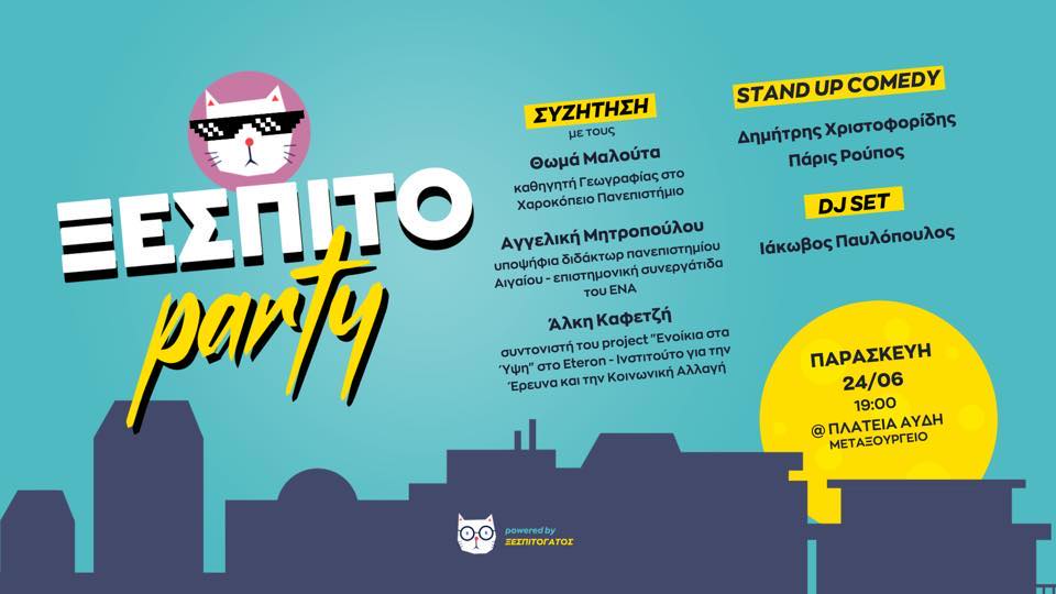 Και καθώς η Αθήνα γίνεται αφιλόξενη για τους κατοίκους της, οι Ξεσπιτόγατοι αυτής της πόλης αποφασίζουν να το ρίξουν έξω. Πάρτι, λοιπόν την ερχόμενη Παρασκευή 24 Ιουνίου στην πλατεία Αυδή, στο Μεταξουργείο, μετά τις 7 το απόγευμα. Το event ξεκινά με μια μικρή εισαγωγική συζήτηση για το στεγαστικό ζήτημα με το Θωμά Μαλούτα, καθηγητή Κοινωνικής Γεωγραφίας στο Χαροκόπειο Πανεπιστήμιο, την Αγγελική Μητροπούλου, υποψήφια διδάκτορα Πανεπιστημίου Αιγαίου και επιστημονική συνεργάτιδα του Ινστιτούτου ΕΝΑ και τον Άλκη Καφετζή, συντονιστή του project Ενοίκια στα Ύψη στο Eteron-Iνστιτούτο για την Έρευνα και την Κοινωνική Αλλαγή.
