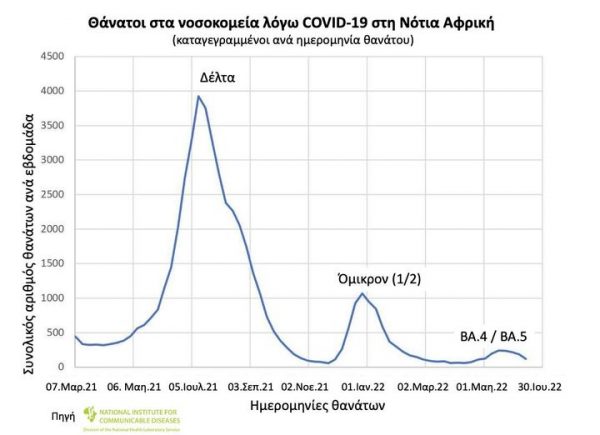 Βλέπουμε καταρχάς πως τον τελευταίο χρόνο στη Νότια Αφρική (ΝΑ) τα δύο κύματα της Όμικρον είχαν σημαντικά μικρότερες επιπτώσεις από αυτό της Δέλτα. Και το κύμα της Β4/Β5 πολύ μικρότερες σε σύγκριση με αυτό των Όμικρον 1 και 2 όσον αφορά τους θανάτους που καταγράφηκαν στα νοσοκομεία.