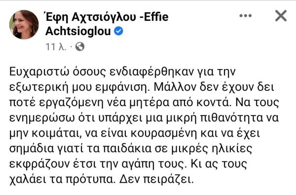 H βουλευτής του ΣΥΡΙΖΑ στην ανάρτησή της έγραψε: «Ευχαριστώ όσους ενδιαφέρθηκαν για την εξωτερική μου εμφάνιση. Μάλλον δεν έχουν δει ποτέ εργαζόμενη νέα μητέρα από κοντά.Να τους ενημερώσω ότι υπάρχει μια μικρή πιθανότητα να μην κοιμάται, να είναι κουρασμένη και να έχει σημάδια γιατί τα παιδάκια σε μικρές ηλικίες εκφράζουν έτσι την αγάπη τους. Κι ας τους χαλάει τα πρότυπα. Δεν πειράζει».