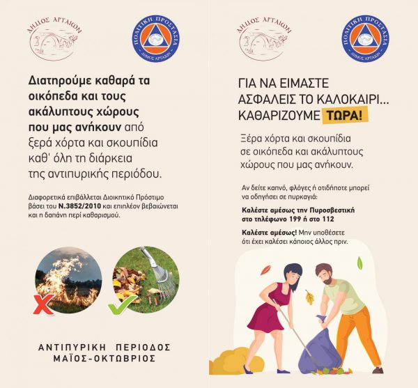 Σε αυτό, μεταξύ άλλων, υπενθυμίζεται η νομική υποχρέωση των κατοίκων να διατηρούν τα οικόπεδα τους καθαρά από ξερόχορτα, αντικείμενα ή εκρήξιμες ύλες μέχρι και την λήξη της αντιπυρικής περιόδου, δηλαδή τον Οκτώβριο του 2022. Παράλληλα, παρέχονται και χρήσιμες πληροφορίες για την περίπτωση αντιμετώπισης πυρκαγιάς.