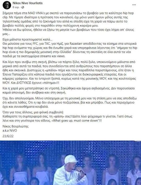 Όχι, δεν απολογούμαι. Μόνο υπόσχομαι με τη μουσική μου και τη στάση μου να σας αποδείξω ότι κάνετε λάθος. Ότι η rap δεν είναι μόνο ποζεριλίκια, βία και μπράβοι. Πως και περιεχόμενο έχει και συναισθήματα κουβαλά. Όσο για τους άλλους, μια φιλική συμβουλή: Καθαρίστε τη συμπεριφορά σας, τη «φάση» σας!!!Δείτε λίγο ψύχραιμα τι γίνεται. Γιατί όπως λένε και στη γενέτειρα του είδους, «What goes up, must come down”!!! Νίκος Βουρλιώτης a.k.a NiVO».