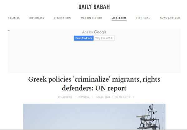 Σε δημοσίευμα της η Daily Sabah υποστηρίζει ότι «η μεταναστευτική πολιτική της Ελλάδας επικεντρώνεται σε ζητήματα ασφάλειας» και δημιουργεί «μια ατμόσφαιρα φόβου» μεταξύ των μεταναστών και των υποστηρικτών τους, επικαλούμενη την Ειδική Εισηγήτρια του ΟΗΕ για την υπεράσπιση των ανθρωπίνων δικαιωμάτων, Μαίρη Λώλορ, προσθέτοντας ότι αυτή η πολιτική έχει «ασφυκτική επίδραση» στην κοινωνία των πολιτών.