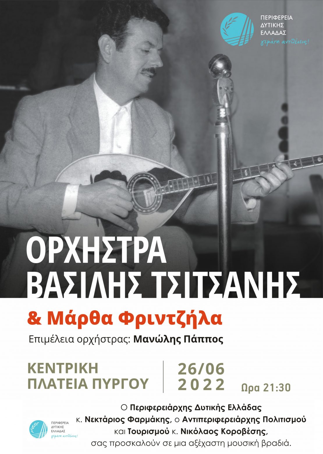 Στα πλαίσια των εκδηλώσεων «Καλοκαίρι Πολιτισμού 2022», η Περιφέρειας Δυτικής Ελλάδας διοργανώνει δύο μοναδικές εκδηλώσεις – αφιερώματα στον σημαντικότερο δημιουργό της ελληνικής λαϊκής μουσικής, τον Βασίλη Τσιτσάνη.