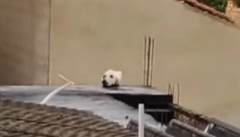 Στο βίντεο με τίτλο «Απροσδόκητο» φαίνεται ένας λευκός σκύλος με σκούρα μύτη και στόμα να βρίσκεται πάνω στην άκρη μιας στέγης.