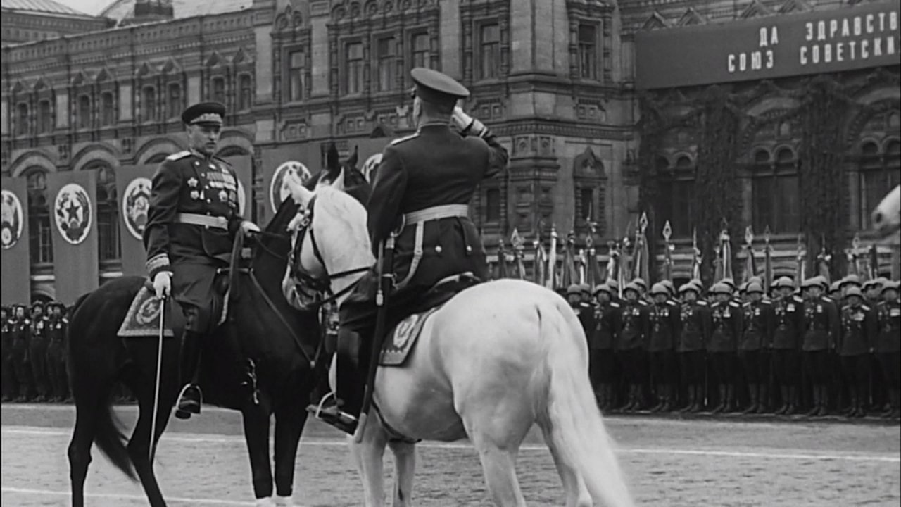 Ο Ζούκοφ ανταπέδωσε τον χαιρετισμό, και με το άλογο του κατευθύνθηκε προς την πλευρά του Μαυσωλείου του Λένιν, στην ταράτσα του οποίου βρισκόταν ο Ιωσήφ Στάλιν.