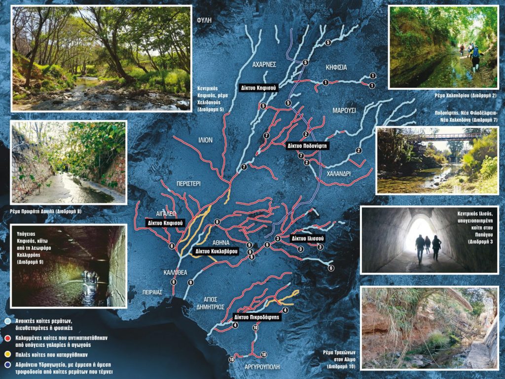 Χτισμένες κοίτες αλλά και περπάτημα στο νερό δίπλα σε πλούσια κοπάδια από ψάρια, πέρασμα στην απέναντι όχθη με σκοινί, παλιά γεφύρια, ήχους από βατράχια και καταπράσινη βλάστηση που θυμίζει εξοχή περιλαμβάνουν, μεταξύ άλλων, οι ιδιαίτερες αυτές εξερευνήσεις. Η ομάδα της Αστικής Σπηλαιολογίας, που έχει χαρτογραφήσει την υπόγεια Αθήνα και μαζί με αυτήν τους χειμάρρους και τα ρέματά της, καθοδηγεί το κοινό από την Πεντέλη μέχρι τον Αλιμο, στο ρέμα Κοκκιναρά, στον Ποδονίφτη, στον Γιαμπουρλά, στον Κεντρικό Ιλισό, στον Ηριδανό του 19ου αιώνα και αλλού, σε μια περιπετειώδη πορεία με ιστορικές αναφορές και πληροφορίες άγνωστες στο ευρύ κοινό.