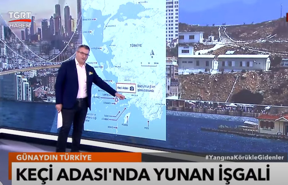 «Ας δούμε αγαπητοί τηλεθεατές το νησί Ψέριμος που είναι υπό ελληνική κατοχή» λέει ο παρουσιαστής ενημερωτικής εκπομπής στον τουρκικό τηλεοπτικό σταθμό TGRT (φωτογραφία, επάνω, από το YouTube).