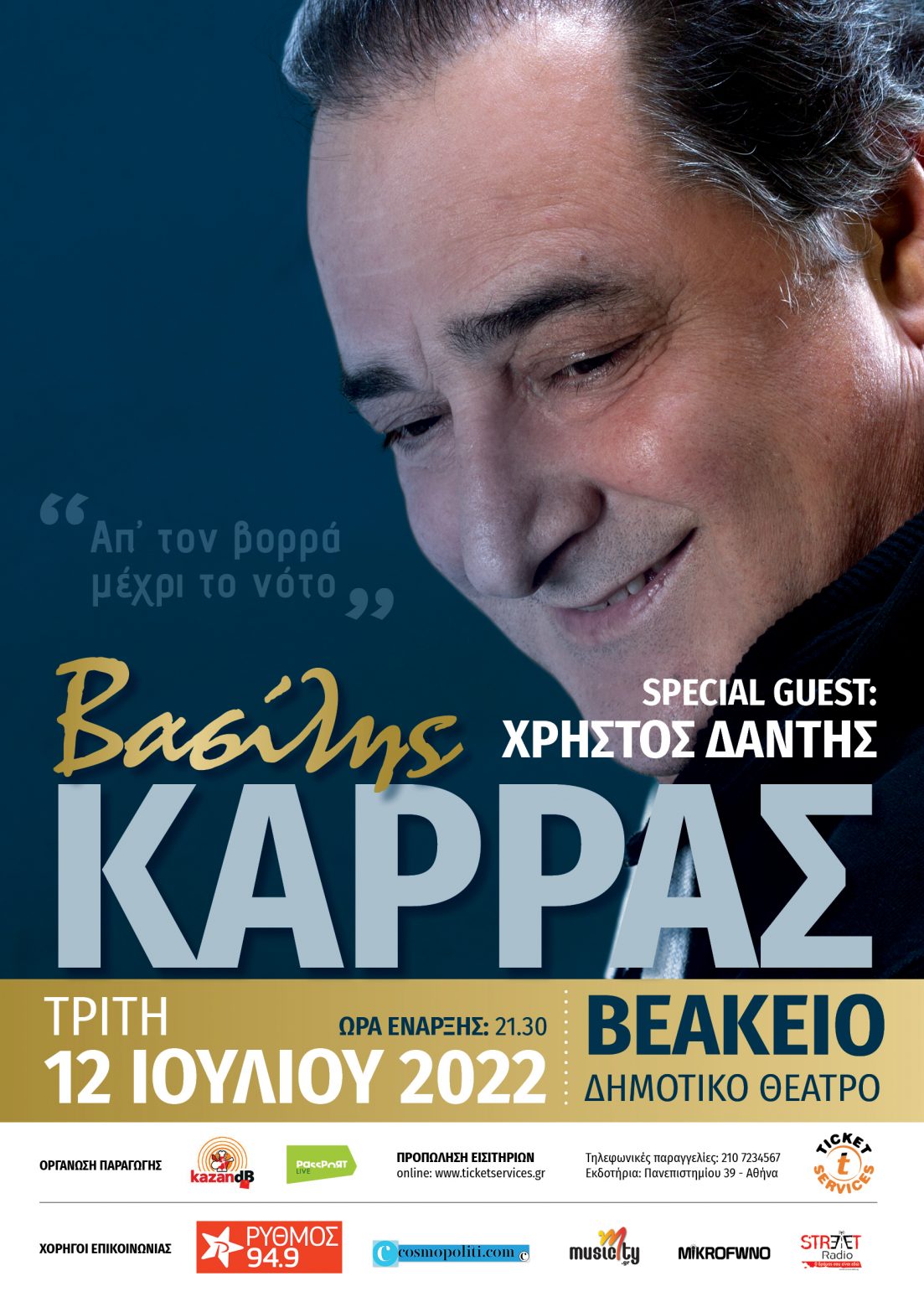 Ο Βασίλης Καρράς θα είναι εκεί ερμηνεύοντας όλες τις μεγάλες επιτυχίες του. «Νύχτα ξελογιάστρα» , «Μη χαθείς», «Λέγε ό,τι θες», «Άστην να λέει», «Δεν πάω πουθενά», «Μ’ έχεις κάνει αλήτη», «Χρέωσε το σε μένα», «Μεθυσμένη μου αγάπη», «Πάρε τον δρόμο κι έλα», «Απορώ αν αισθάνεσαι τύψεις», «Φταις εσύ», «Όλα ένα ψέμα», «Όταν τα χρόνια σου περάσουν», «Πριγκηπέσσα», «Θα της περάσει», «Δεν μ’ ακούς», «Άλλοθι», «Όπως παλιά», «Απ’ τον Βορρά μέχρι τον Νότο», «Τα καλύτερα ταξίδια» και τόσες άλλες μεγάλες επιτυχίες.