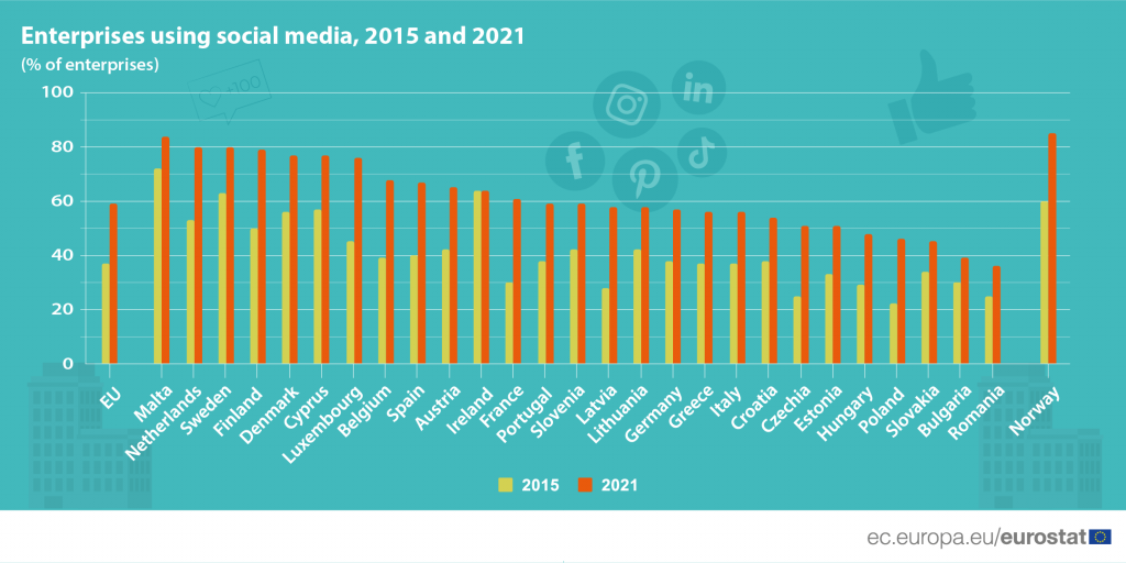 Η χρήση των μέσων κοινωνικής δικτύωσης ήταν πιο δημοφιλής μεταξύ των επιχειρήσεων, στη Μάλτα (84%), τη Σουηδία και την Ολλανδία (80%) και τη Φινλανδία (79%), ενώ ήταν λιγότερο δημοφιλής μεταξύ των επιχειρήσεων στη Ρουμανία (36%), τη Βουλγαρία (39%) και τη Σλοβακία (45%).