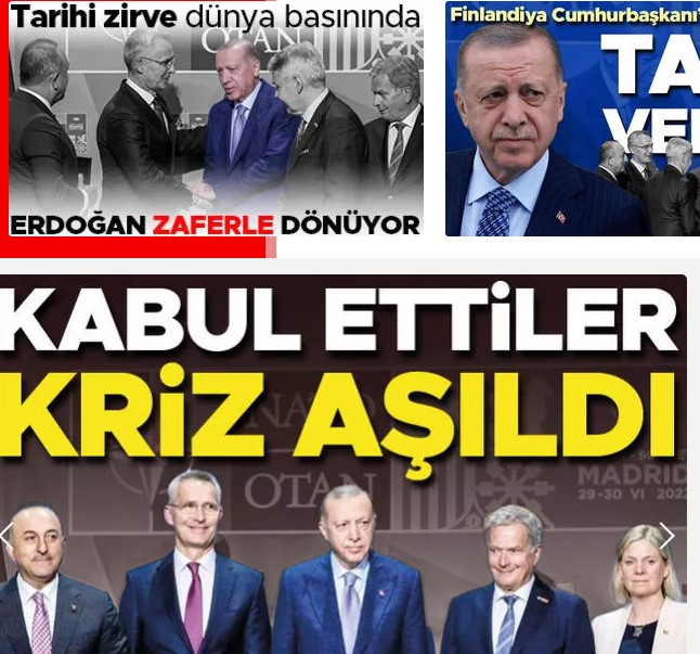 Οι εφημερίδες στα πρωτοσέλιδά τους αναφέρουν ότι οι δύο χώρες αποδέχθηκαν τους όρους του Τούρκου προέδρου και έτσι ο Ερντογάν «πήρε αυτό που ήθελε» και επετεύχθη συμφωνία.