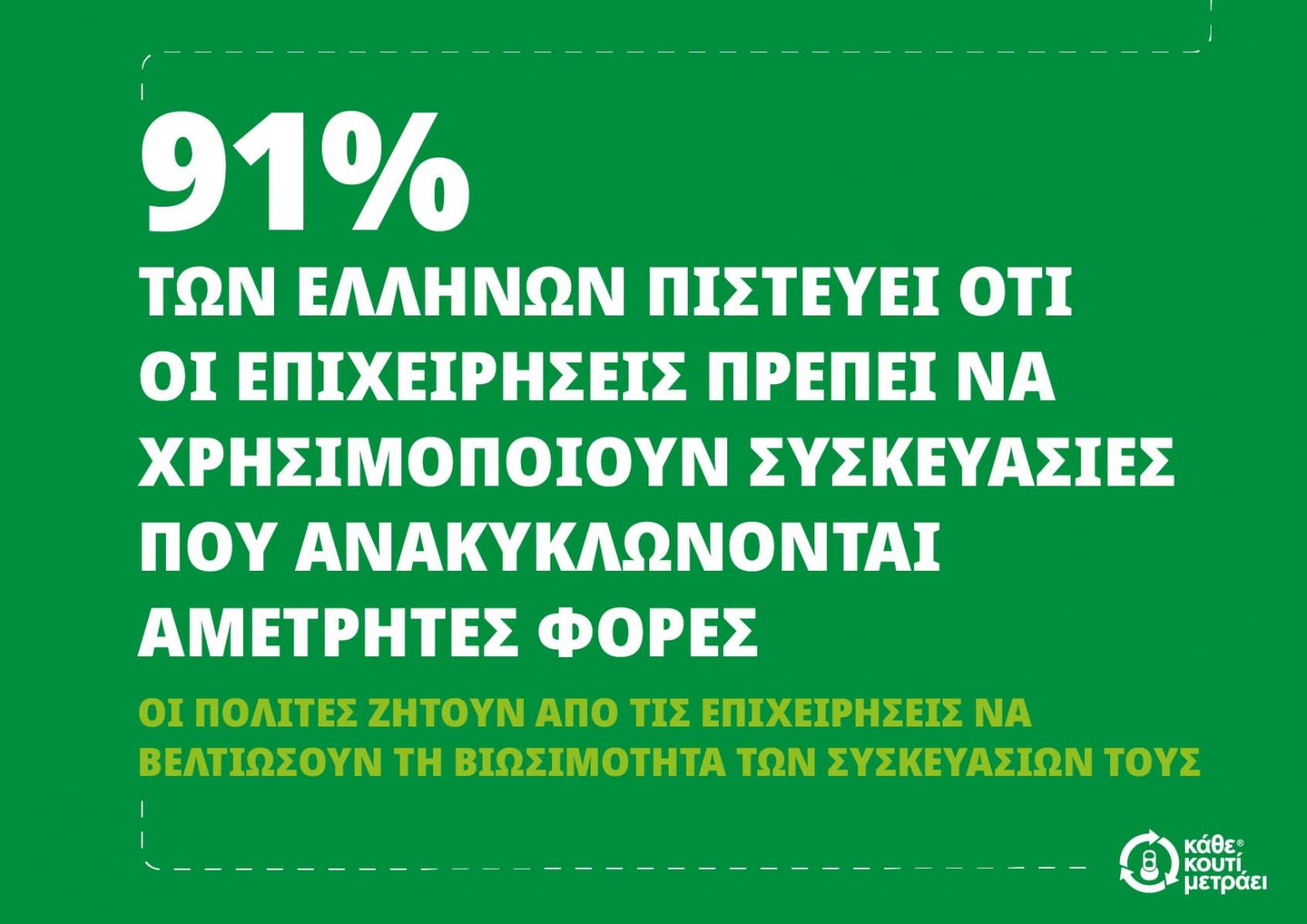 Το 87% των Ευρωπαίων δήλωσε ότι οι εταιρείες θα πρέπει να χρησιμοποιούν μόνο συσκευασίες που ανακυκλώνονται αμέτρητες φορές, θέση με την οποία συμφωνεί και το 91% των Ελλήνων.