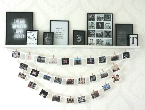 Πάνω σε δύο ράφια να τοποθετήσεις φωτογραφίες και εικόνες που σε εμπνέουν καθημερινά μέσα σε κορνίζες με μαύρο σκελετό, και από κάτω να κρεμάσεις σε σχοινί polaroid φωτογραφίες με τα αγαπημένα σου πρόσωπα!