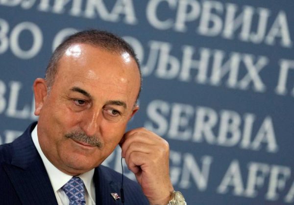 Ο υπουργός Εξωτερικών της Τουρκίας Μεβλούτ Τσαβούσογλου στη διάρκεια κοινής συνέντευξής του, στο Βελιγράδι, με τον σέρβο ομόλογό του Νίκολα Σελάκοβιτς (φωτογραφία AP)