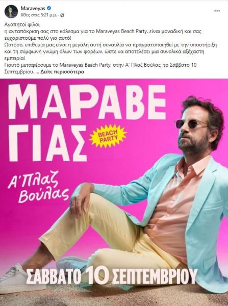 Με πνεύμα συνεργασίας και κατανόησης συζητήσαμε με τον Δήμαρχο Βούλας – Βάρης – Βουλιαγμένης, κο Κωσταντέλλο και συναποφασίσαμε να μεταφέρουμε το Maraveyas Beach Party, στην Α’ Πλαζ Βούλας, το Σάββατο 10 Σεπτεμβρίου.