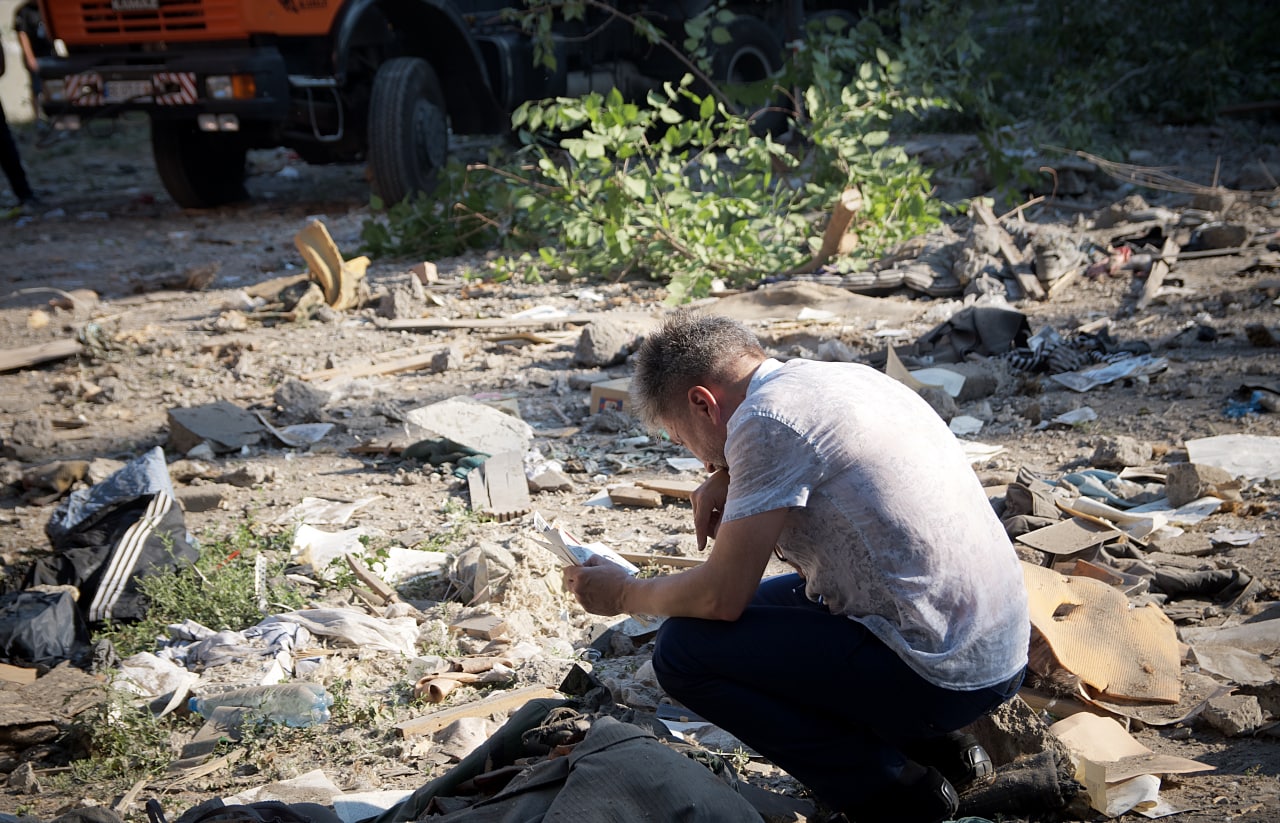 Ισχυρές εκρήξεις ακούστηκαν τις πρώτες μεταμεσονύχτιες ώρες σήμερα Σάββατο στην ουκρανική πόλη Μικολάιφ, ανακοίνωσε ο δήμαρχός της, ο Ολεξάντρ Σένκεβιτς, μέσω της πλατφόρμας Telegram (φωτογραφία από το Twitter, επάνω: μαζεύοντας φωτογραφίες από τα συντρίμμια του σπιτιού του, στη Μικολάιφ).
