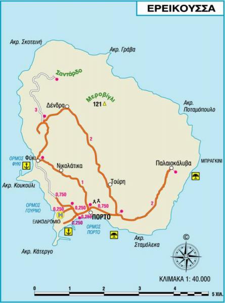 Κατάφυτη από ελιές, κυπαρίσσια, σπάρτα και θάμνους, η Ερεικούσσα με τις όμορφες ακρογιαλιές της αποτελεί ιδανικό τόπο για ήσυχες διακοπές και γραφικούς περιπάτους.