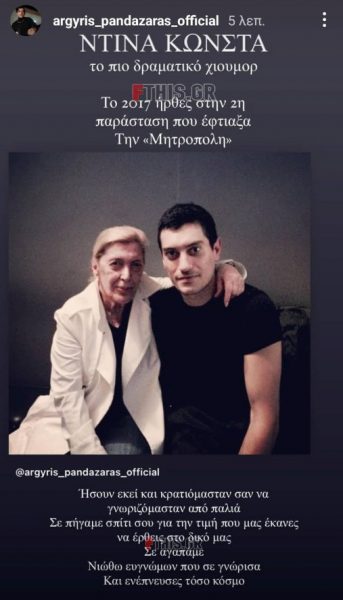 Έγραψε συγκεκριμένα: «Ντίνα Κώνστα. Το πιο δραματικό χιούμορ. Το 2017 ήρθες στην 2η παράσταση που έφτιαξα. Την “Μητρόπολη”. Ήσουν εκεί και κρατιόμασταν σαν να γνωριζόμασταν από παλιά. Σε πήγαμε σπίτι σου για την τιμή που μας έκανες να έρθεις στο δικό μας. Σε αγαπάμε. Νιώθω ευγνώμων που σε γνώρισα και ενέπνευσες τόσο κόσμο».