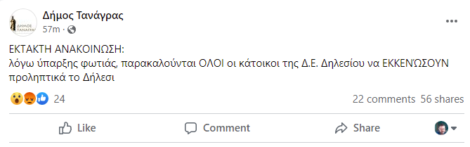 «Η φωτιά ξεκίνησε λίγο έξω από το Δήλεσι για τον λόγο αυτό έχουμε ζητήσει την προληπτική εκκένωση του οικισμού. Είναι στα όρια με την κατοικημένη περιοχή. Δεν βοηθάνε και οι άνεμοι καθόλου. Πιστεύω όμως ότι ίσως προλάβουμε τα χειρότερα διότι περιμένουμε κι άλλη πυροσβεστική δύναμη να έρθει. Περιμένουμε τρία ακόμα αεροπλάνα», δήλωσε ο δήμαρχος Τανάγρας, Βασίλης Περγάλιας στο protothema.gr.