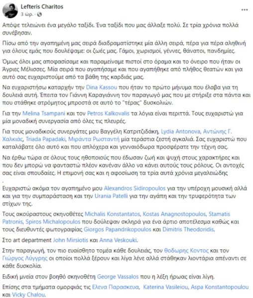 Ο σκηνοθέτης, Λευτέρης Χαρίτος, λίγο πριν πέσουν οι τίτλοι τέλους θέλησε να αποχαιρετίσει συντελεστές και ηθοποιούς και να πει το δικό του «αντίο».
