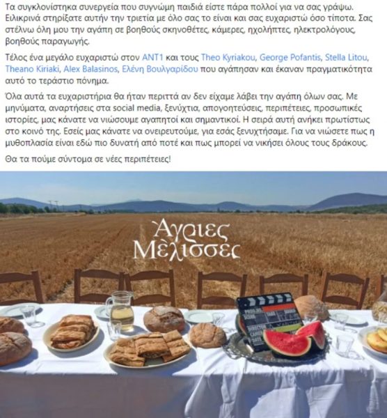 Όμως όλοι μας αποφασίσαμε και παραμείναμε πιστοί στο όραμα και το όνειρο που ήταν οι Άγριες Μέλισσες. Μία σειρά που αγαπήσαμε και που αγαπήθηκε από πλήθος θεατών και για αυτό σας ευχαριστούμε από τα βάθη της καρδιάς μας.