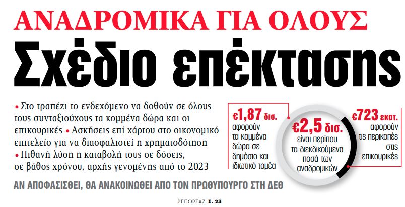 Αναδρομικά για όλους Σχέδιο επέκτασης •Στο τραπέζι το ενδεχόμενο να δοθούν σε όλους τους συνταξιούχους τα κομμένα δώρα και οι επικουρικές •Ασκήσεις επί χάρτου στο οικονομικό επιτελείο για να διασφαλιστεί η χρηματοδότηση •Πιθανή λύση η καταβολή τους σε δόσεις, σε βάθος χρόνου, αρχής γενομένης από το 2023