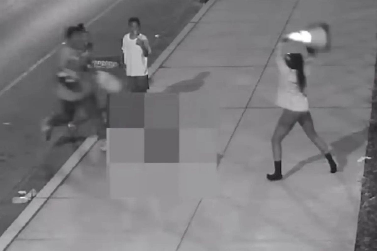 Ενώ ο 72χρονος βρίσκεται ακόμα πεσμένος κάτω, ένα κορίτσι σηκώνει τον ίδιο κώνο και τον πετά πάνω του, ενώ ένα άλλο μέλος της παρέας καταγράφει τη σκηνή με το κινητό.