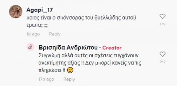 Αυτή τη φορά, η Βρισηίδα δημοσίευσε ένα βίντεο στο Tik Tok όπου εντοπίσαμε ένα σχόλιο το οποίο ήταν αρκετά απρεπές ενώ η απάντηση της ίδιας ήταν άκρως αφοπλιστική.