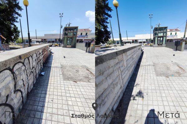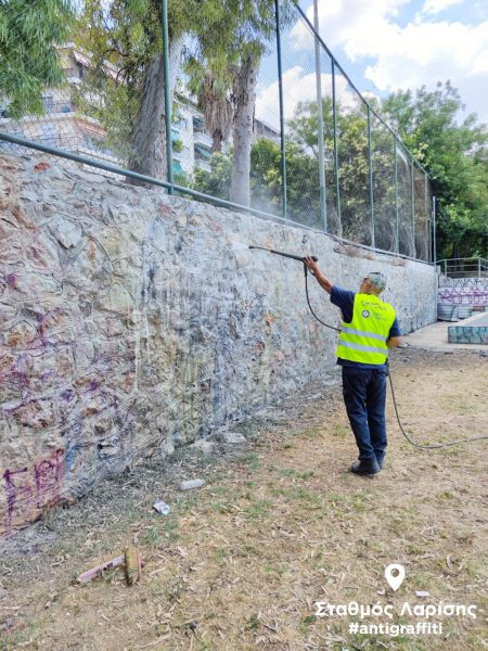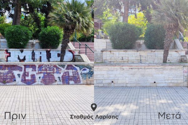 Συγκεκριμένα, στην πολυσύχναστη πλατεία Λαρίσης καθαρίστηκαν συνολικά 460 τ.μ. επιφάνειας από πέτρα και μάρμαρο. Η διαδικασία της αφαίρεσης, με υψηλή πίεση νερού και ειδικό διαλυτικό υγρό (συνολικά 145 λίτρα), χρειάστηκε να επαναληφθεί αρκετές φορές, καθώς οι μπογιές και τα σπρέι από τα γκράφιτι κάλυπταν για μεγάλο χρονικό διάστημα τη συγκεκριμένη επιφάνεια, δυσκολεύοντας το έργο της αποκατάστασης. Παρ’ όλα αυτά, η επιχείρηση, που διήρκεσε περίπου μία εβδομάδα με τη συμμετοχή εννέα εργαζομένων του Δήμου, ολοκληρώθηκε με επιτυχία και η πλατεία έχει αποκτήσει ξανά, έπειτα από πολλά χρόνια, την καθαρή όψη που αρμόζει σε ένα δημόσιο χώρο.
